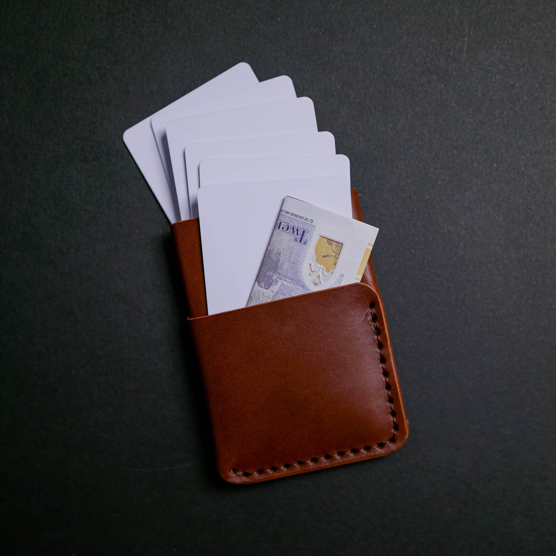 A wrap around design that features space for up to 8 cards and some folded bills. Designed specifically to slip into your front pocket and to ditch the back pocket behemoth. Made of beautiful chestnut "Buttero" vegetable tanned leather from Italy, this wallet will develop a unique patina over time.