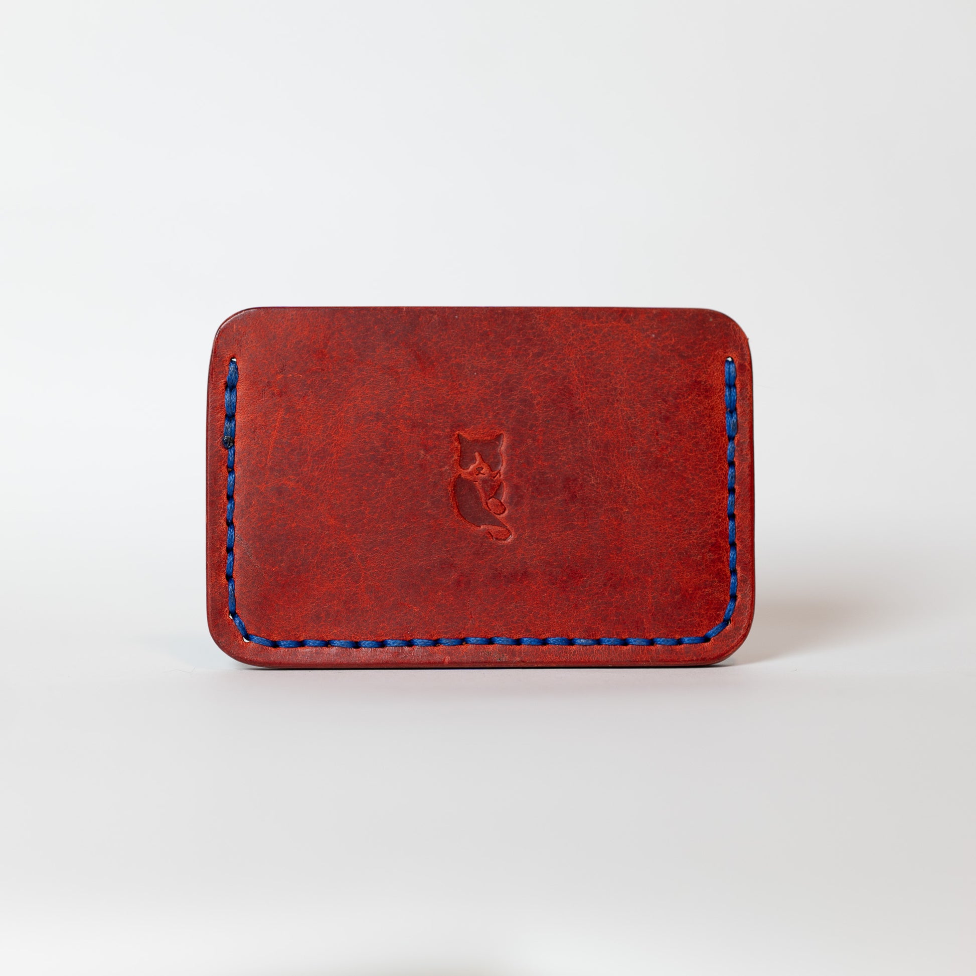 Thicker 1.8mm leather, finished in the UK, makes for a very robust minimalist piece. Personally love the character in this deep red and the contrasting blue thread. Cat motif on outside pocket as a nod to our late workshop companion, Jasper.
